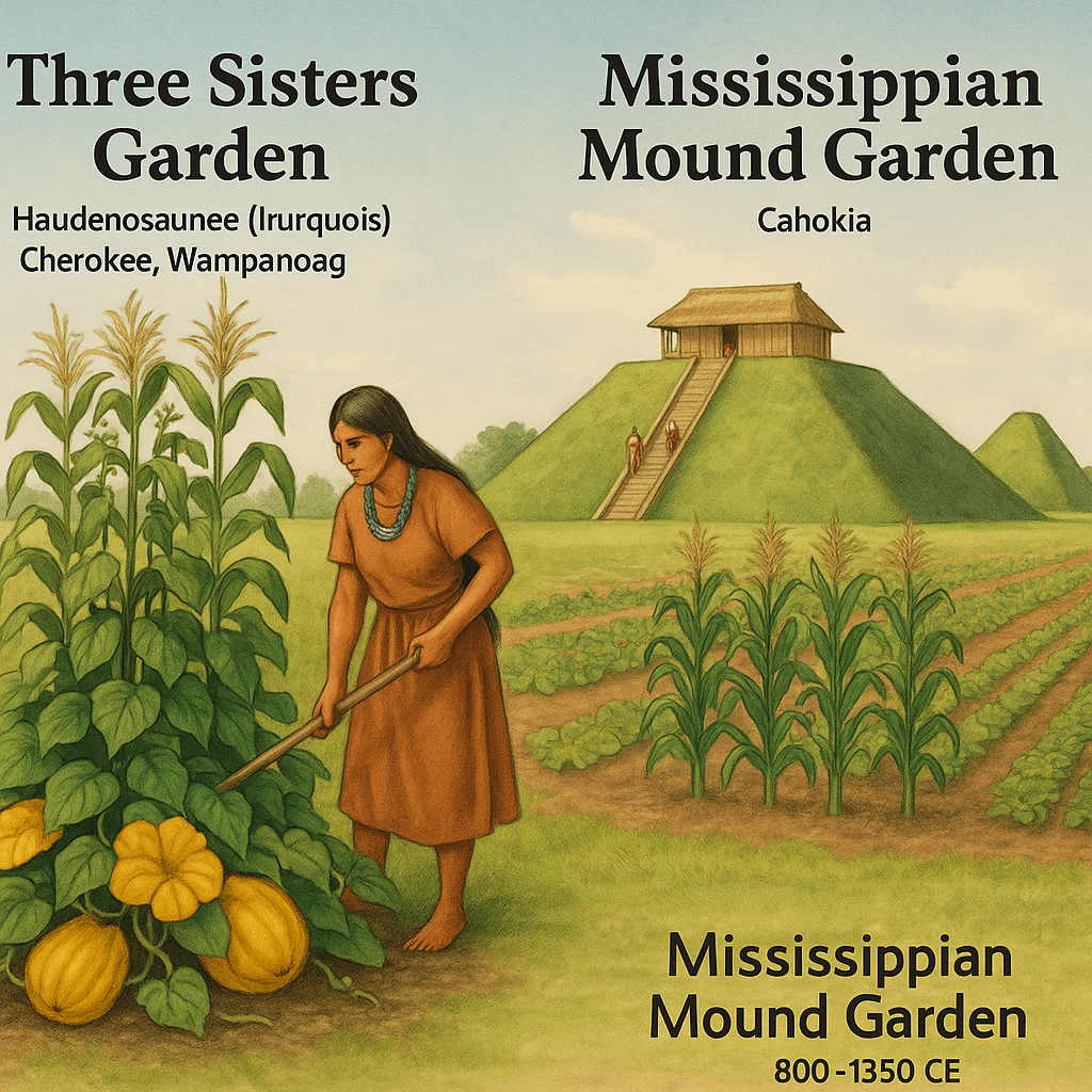 - Key Feature: Corn, beans, and squash grown together in mounds (companion planting)